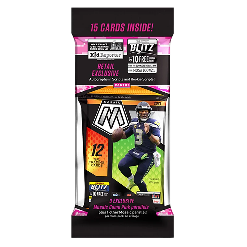 Three Exclusive Mosaic Pink Camo Parallels Per Pack! Featuring Rookie Cards of Trevor Lawrence, Zach Wilson, Trey Lance, Justin Fields, Mac Jones, Najee Harris, Travis Etienne, Javonte Williams, Michael Carter, Ja’Marr Chase, Jaylen Waddle, Devonta Smith, Kadarius Toney, Rashod Bateman, Kyle Pitts, Pat Freiermuth and Many More!