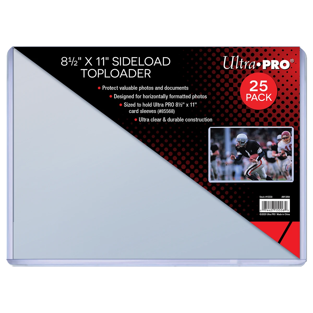 Keep your valuable photo and print collection protected from dirt, debris, and damage with Ultra PRO’s 8-1/2″ x 11″ (215.9 mm x 279.4 mm) Side Load Toploader. These clear, rigid PVC Toploaders are Sized to hold Ultra PRO 8-1/2″ x 11″ soft sleeves. Each pack includes 25 individual Toploaders.