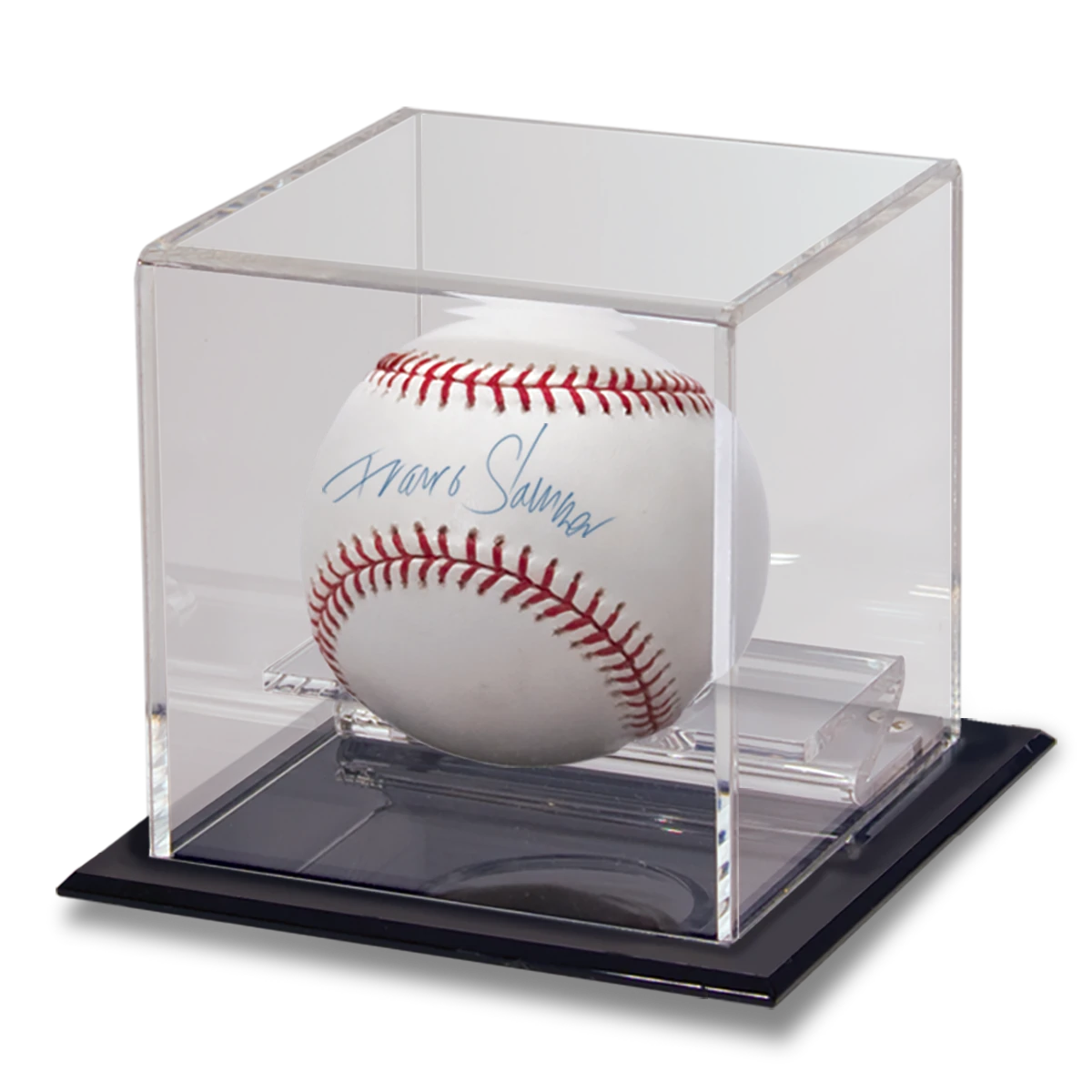 Proudly show off your prized memorabilia with this Z-Design display case, made with an ultra-clear acrylic top ideal for displaying a memorabilia baseball or puck. The bottom “Z” holder creates a ‘floating’ look for your display item. “Z” holder can be unscrewed to turn the holder into a toy, figurine, or POP vinyl figure display case. The black base plate creates a minimalist look and provides space for labels or engraved nameplates. Inside dimension measures 4 inches in height, 3.75 inches in width and depth.