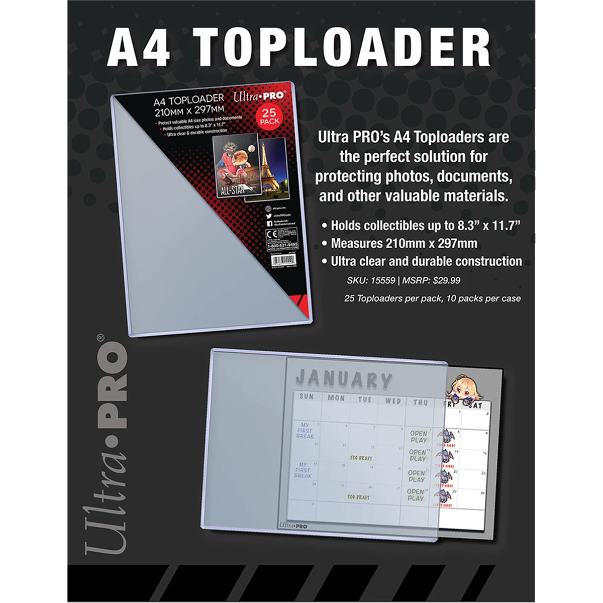 Keep your valuable documents, photos and collectible prints safe from dust, debris and damage with Ultra PRO’s super clear A4 size Toploader. Sized to fit flat media content up to 210mm x 297mm (8.3″ x 11.7″) in size, these rigid PVC plastic holders are ideal for sorting, organizing and transporting your important media. Each pack comes with 25 individual pieces.