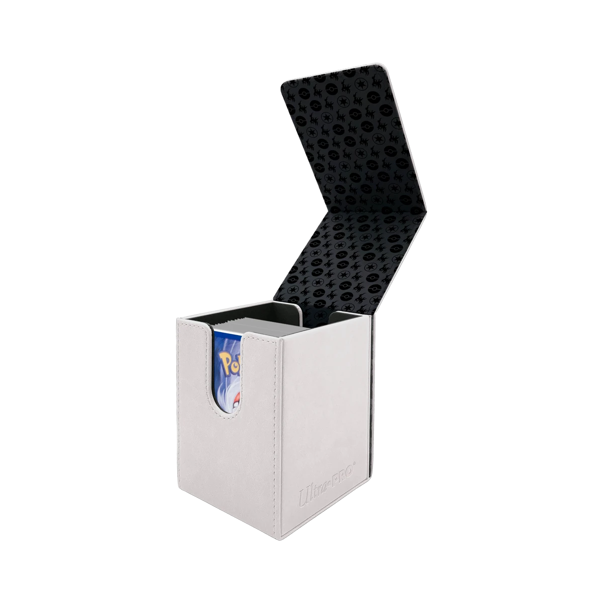 Alcove Flip Boxes for Pokémon feature a debossed image of Arceus on a leatherette finish with foil detailing, a strong magnetic closure, and dual thumb notches for easy access to your deck. This Deck Box® holds up to 100 standard size trading cards double-sleeved in Ultra PRO Deck Protector® sleeves.