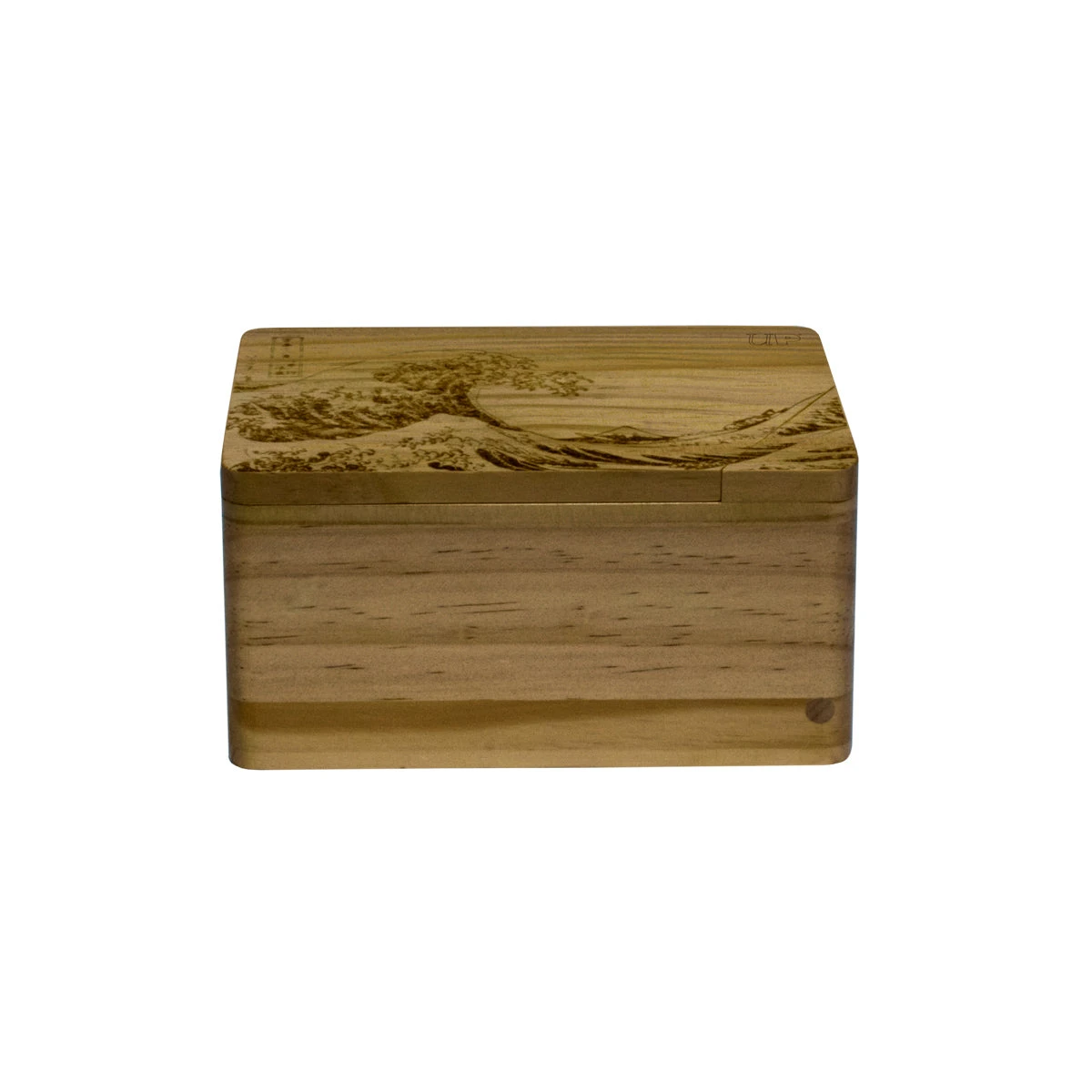 Handmade wood deck box with laser-etched traditional Japanese woodblock art from classical artist Hokusai. Holds 100 double-sleeved cards in Ultra PRO Deck Protector sleeves. Has rollout side dice compartment. Thumb notch for easy access to cards and secure magnetic closure. (Cards, sleeves, and dice not included)