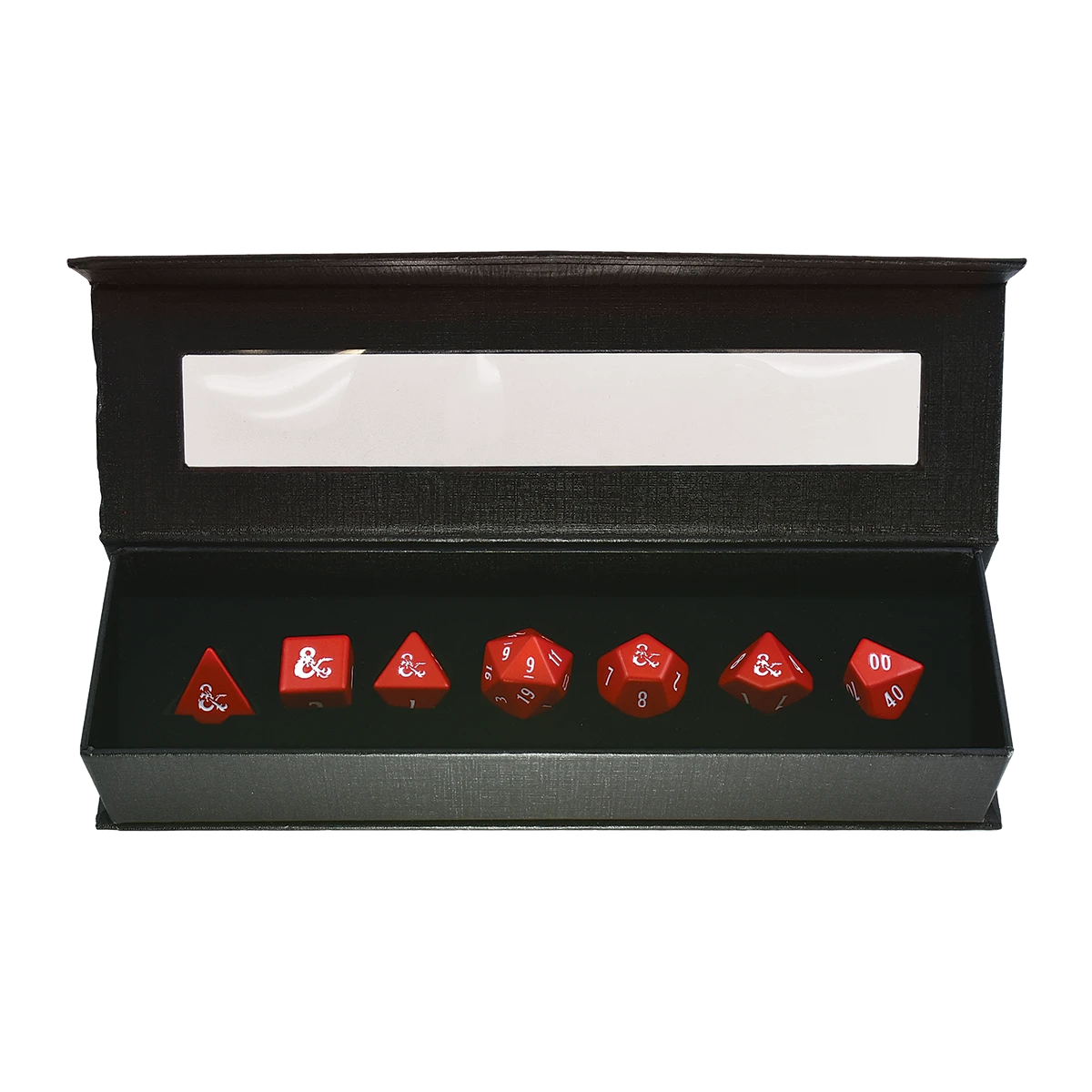 Ward off enemies on your next adventure with the commanding roll of these official Dungeons & Dragons Heavy Metal Red and White 7 RPG Dice! Made from the same heavy, zinc alloy material as the Heavy Metal D20 sets, rolling these dice will send a rumble through the realm! The set includes seven total dice, one each: D4, D6, D8, D10, D12, D20, and a Percentile Die – all the dice you need for your next D&D adventure!
