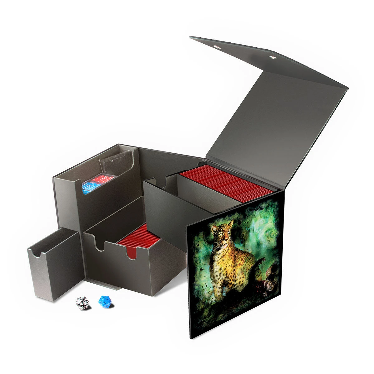 - Holds up to 900 double sleeved cards with an extra compartment for small accessories