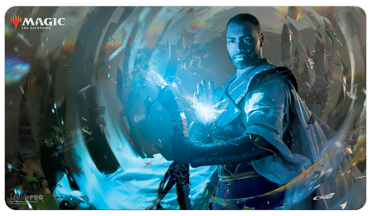 UP your game at your next tournament with these official Magic: The Gathering playmats showcasing highly detailed and vibrant artwork of Magic: The Gathering’s “Teferi, Master of Time” from the popular trading card game’s M21 set. They are made with a premium fabric top to prevent damage to cards during gameplay for tabletop gamers. With dimensions of approximately 24″ X 13-1/2″, this playmat is also the perfect decorative oversized mouse pad for computer and laptop workstations. Non-slip rubber backing lets the playmat lay flat and prevents it from shifting during use.