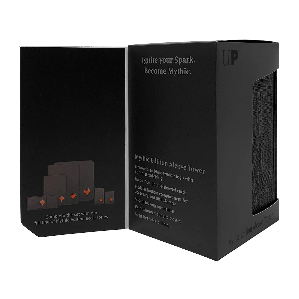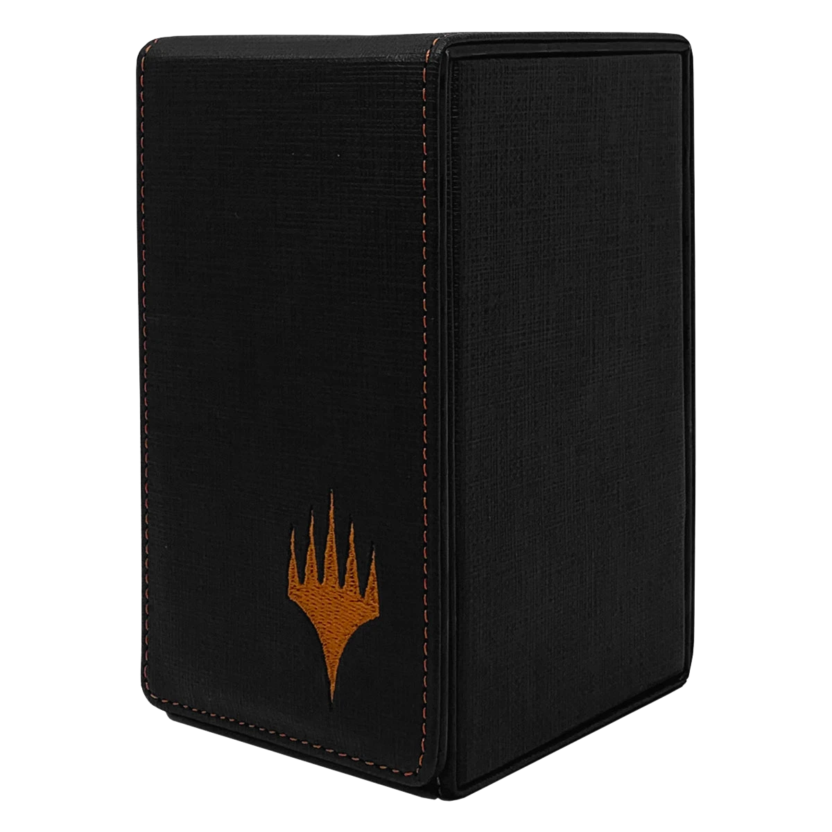 The Mythic Editions are Ultra PRO™s most premium accessories for Magic: The Gathering. This Alcove Tower Deck Box features a black leatherette material with a mythic orange embroidered Planeswalker symbol and matching stitching. Store and protect up to 100 standard size trading cards double-sleeved in Ultra PRO Deck Protector® sleeves. This deck box is made with durable, high-quality materials; features a strong magnetic closure and locking mechanism to securely store your deck; dual thumb notches for easy access when you are ready to play; and a bottom drawer compartment for dice, coins, or other small gaming accessories.