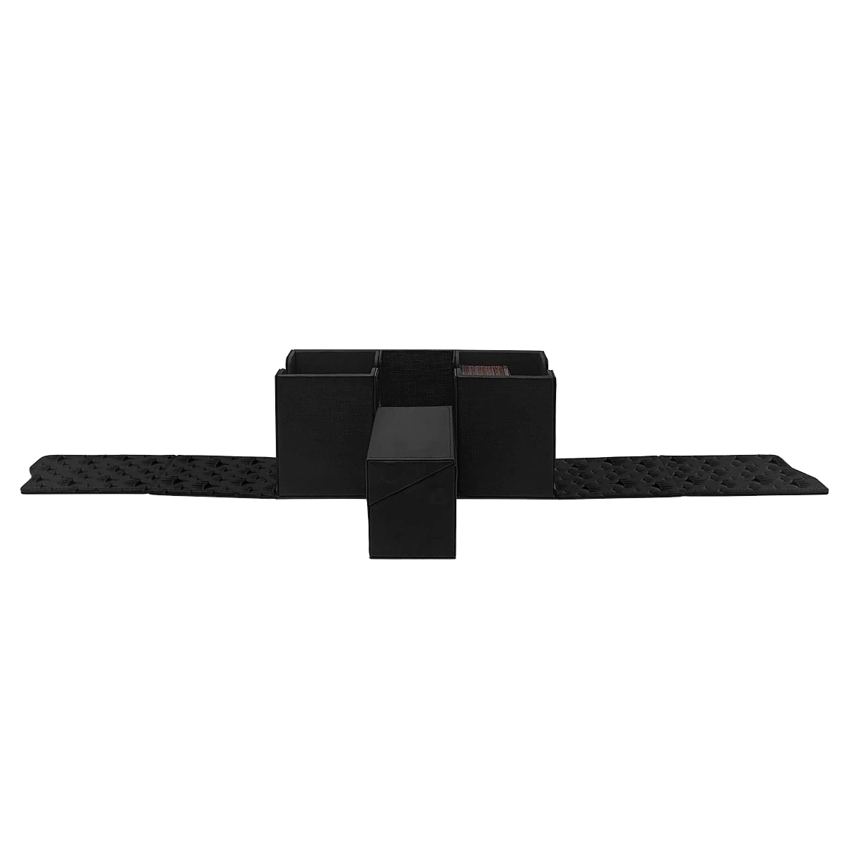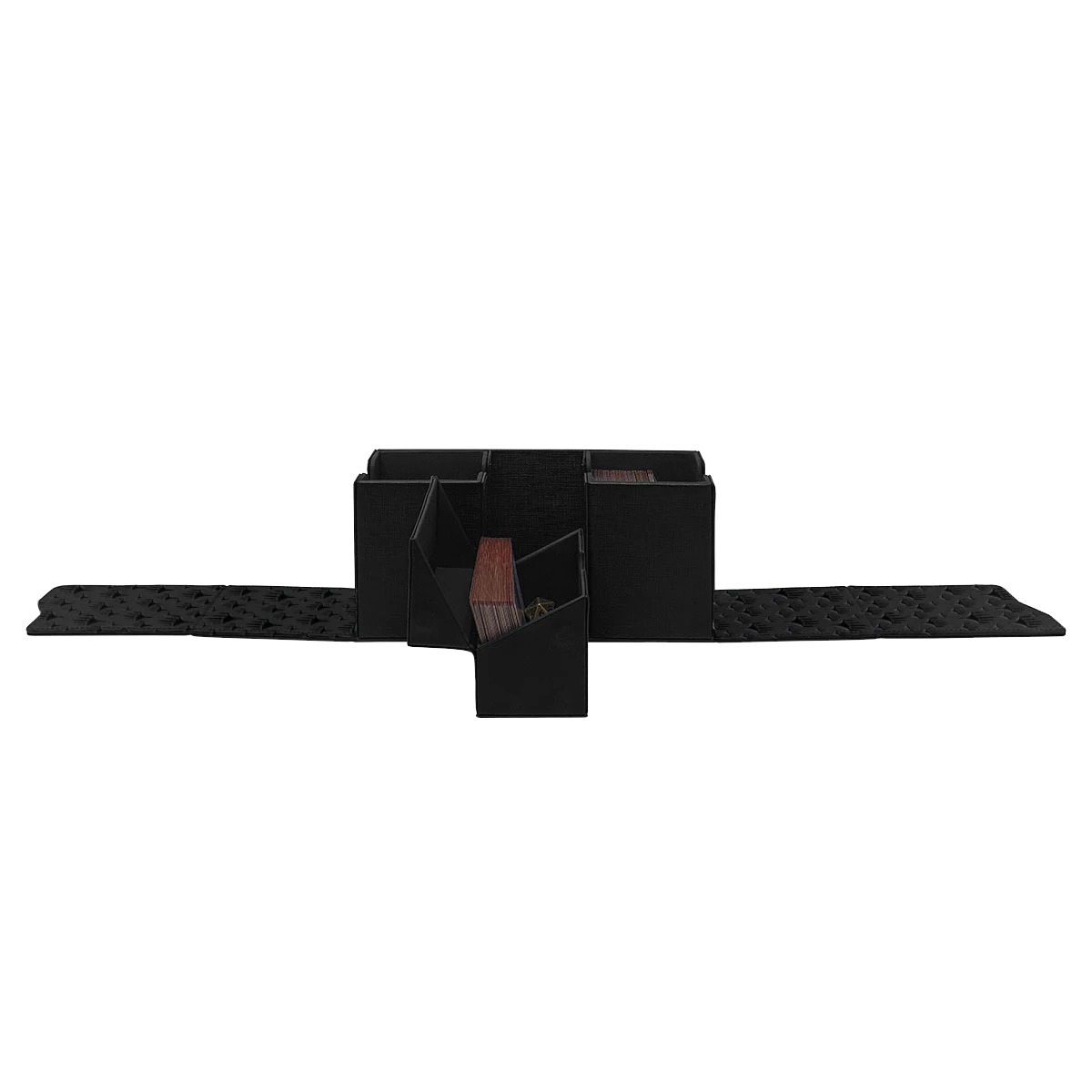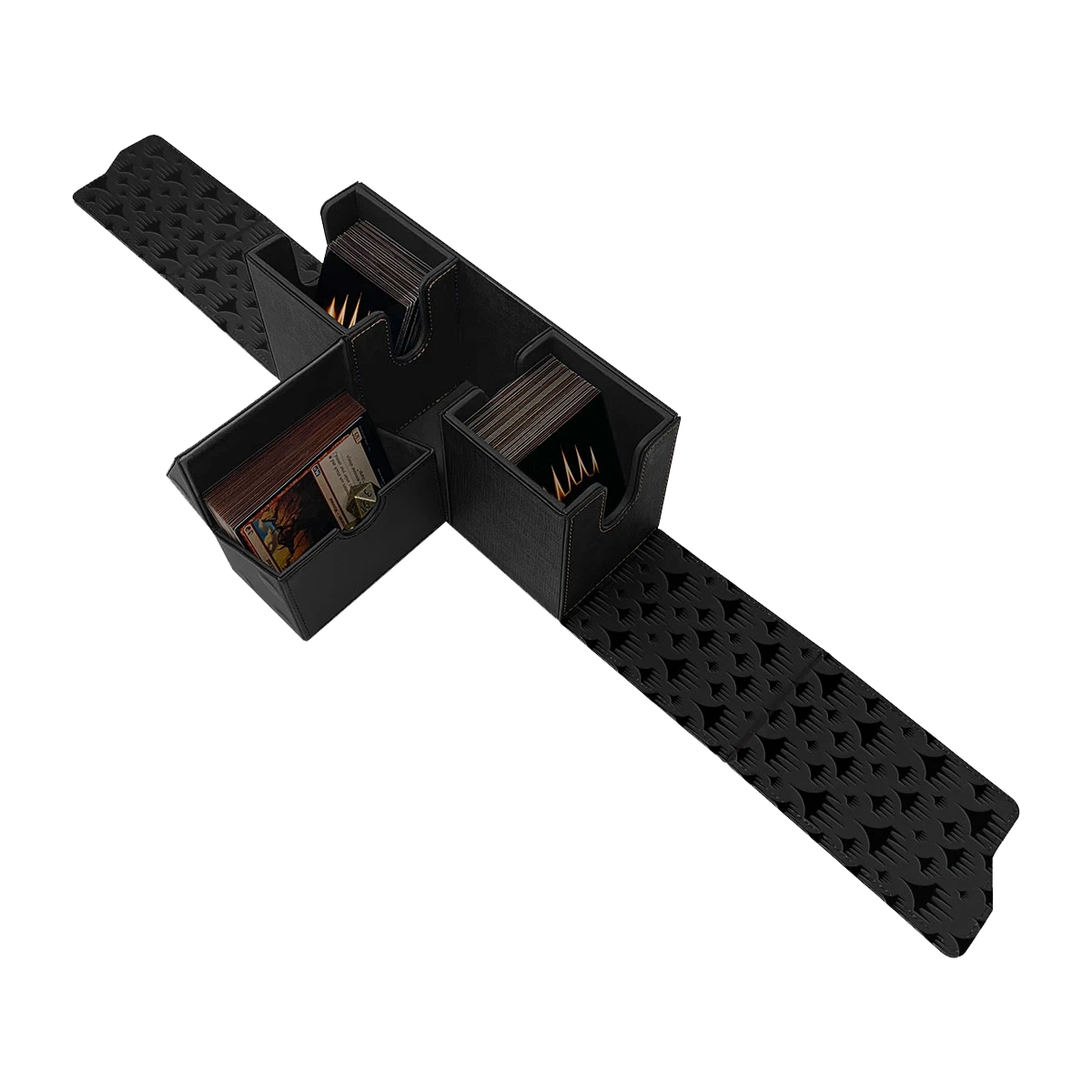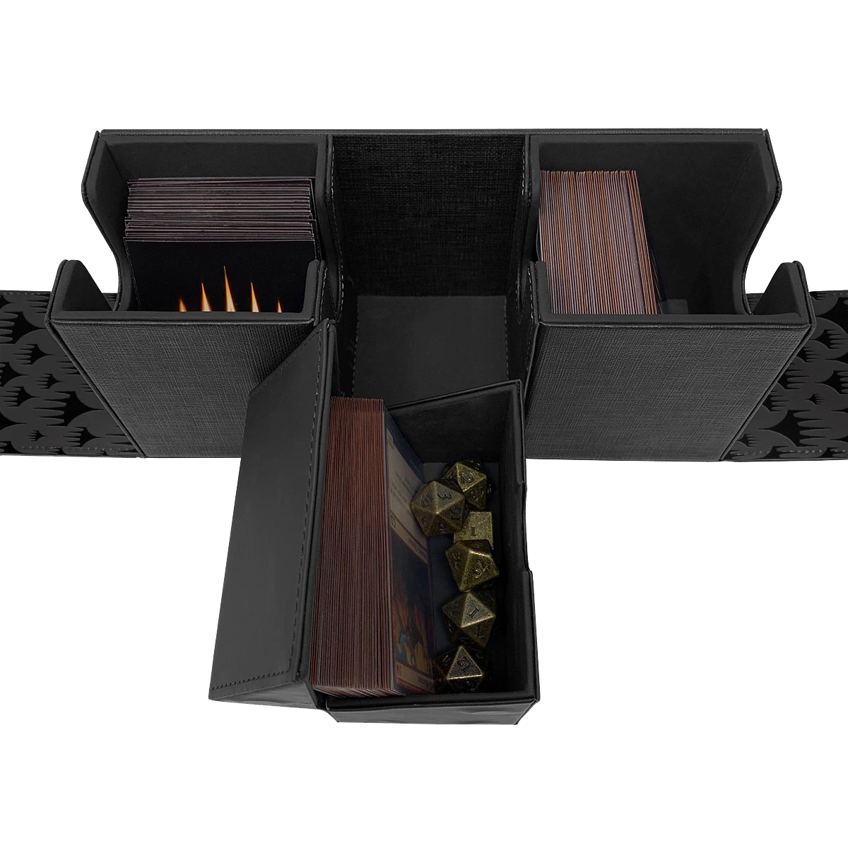 - The center compartment can hold an additional single-sleeved deck or store dice, tokens, counters, and other small gaming accessories.