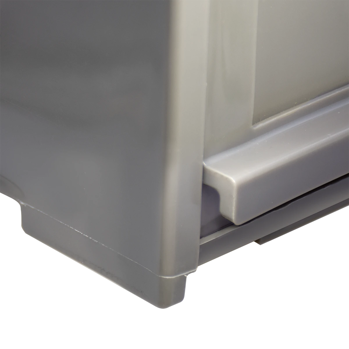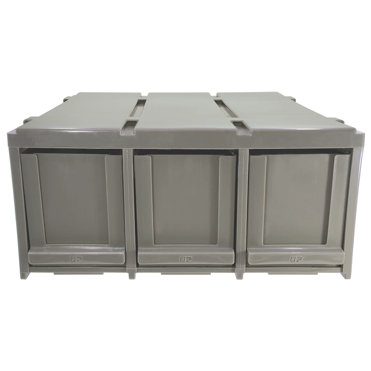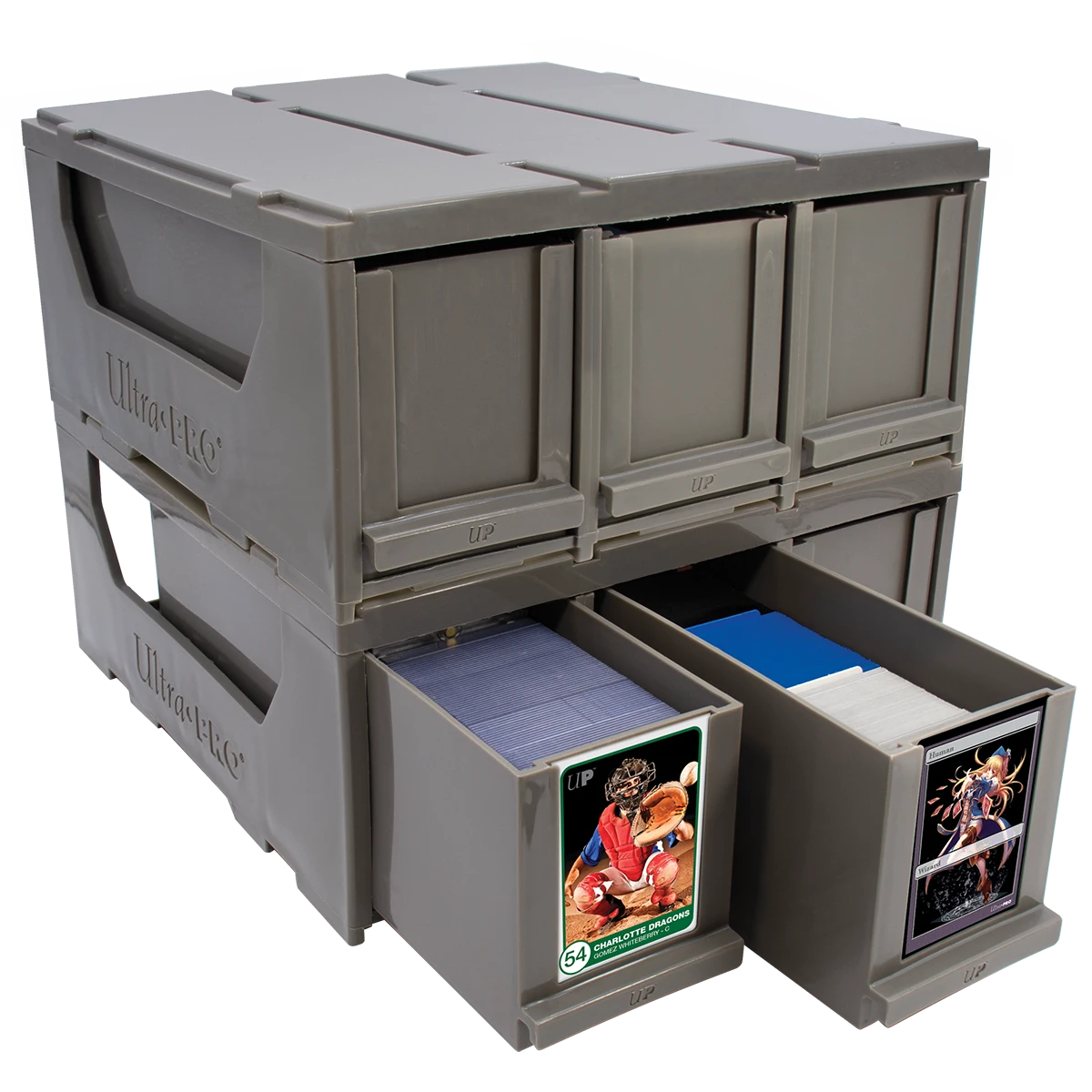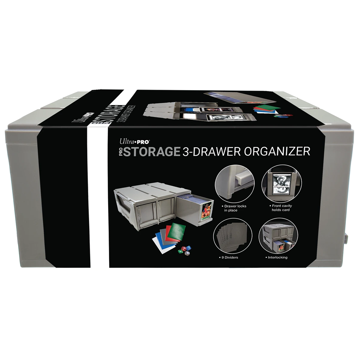 UPgrade your card storage with the PRO-Storage 3-Drawer Organizer by Ultra PRO. With 3 spacious drawers to accommodate cards stored in sleeves, toploaders, ONE-TOUCH, or otherwise unprotected, the rigid polypropylene materials are acid-free and non-PVC for premium storage. Take advantage of a snap-fit lid and removable drawers, allowing you to easily access all three drawers from an open-top or bring one drawer to the table at a time. For further organization, this organizer includes 9 matching card dividers and a front display slot on each drawer sized to fit a standard size trading card. With outer dimensions of 12.96 in. x 5.95 in. x 13.5 in. and a recessed base, these organizers stack safely and store easily in most standard shelving systems.Â