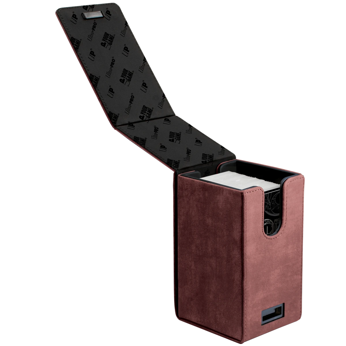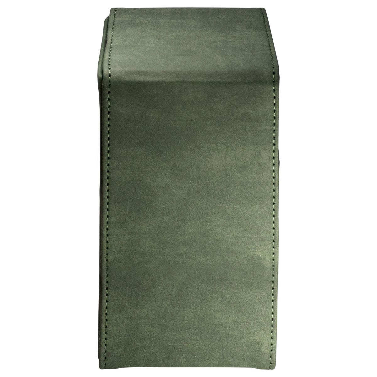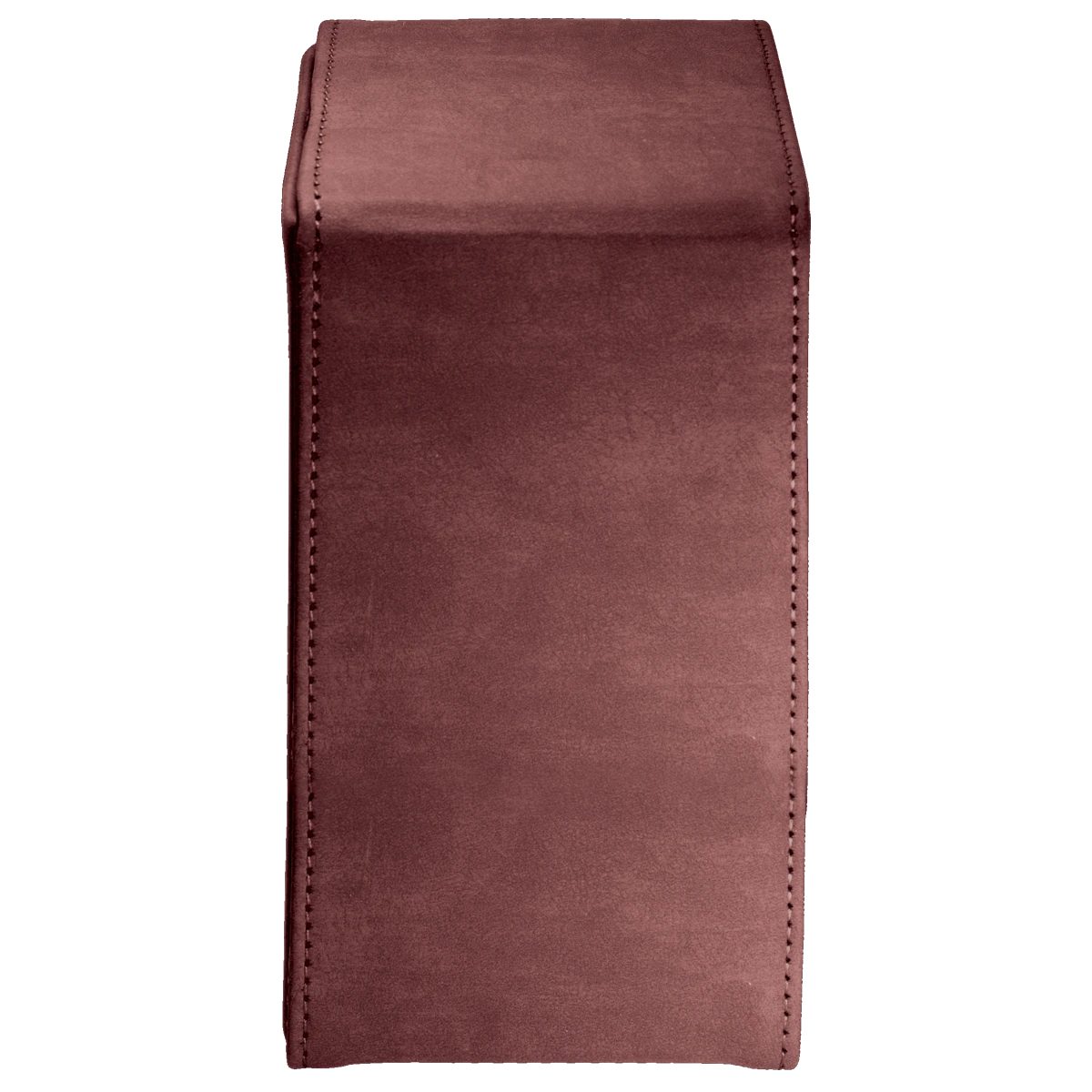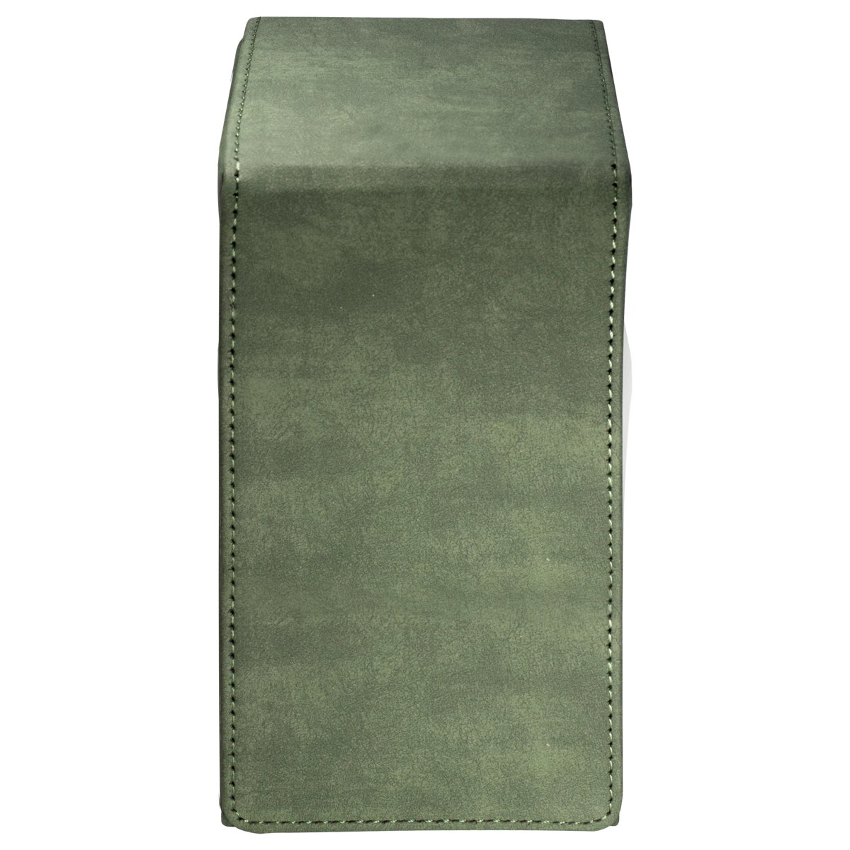 Premium Alcove Tower Flip Deck Box storage cases made with a suede-like material. The Alcove Tower can hold up to 100 double sleeved cards with its lid secured by strong magnetic closures utilizing multiple magnets for extra protection. The lid can be undone on both sides of the box to reveal dual thumb notches for easy access to your deck of cards. The Alcove Tower is a great storage device for organizing and protecting your collection.