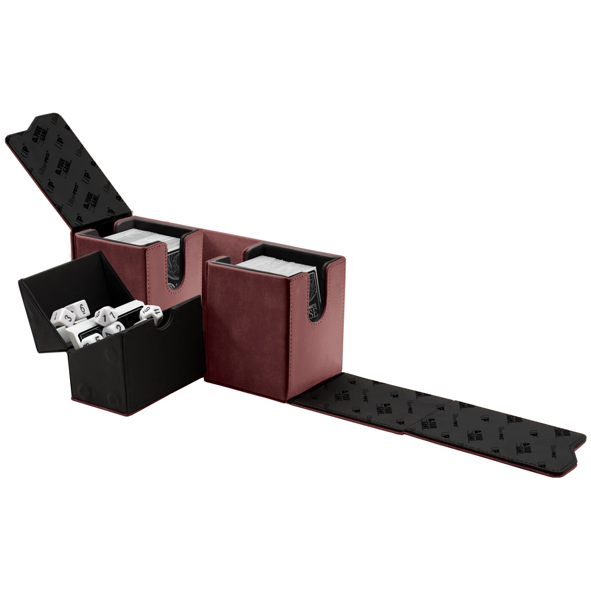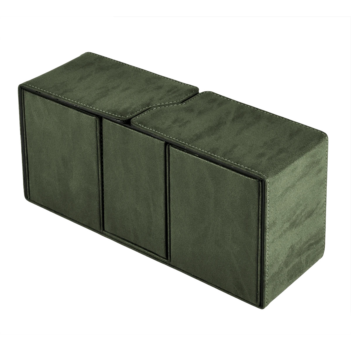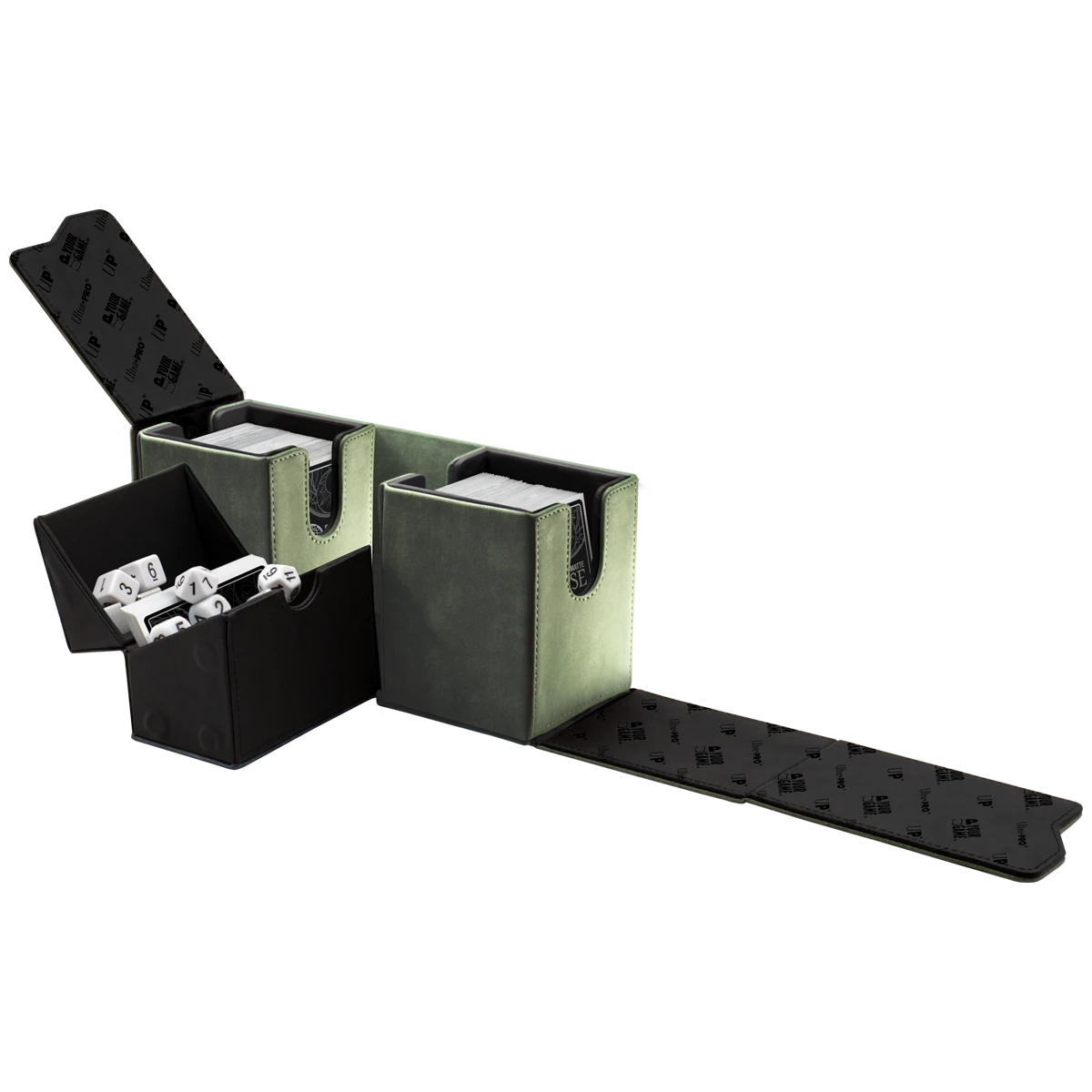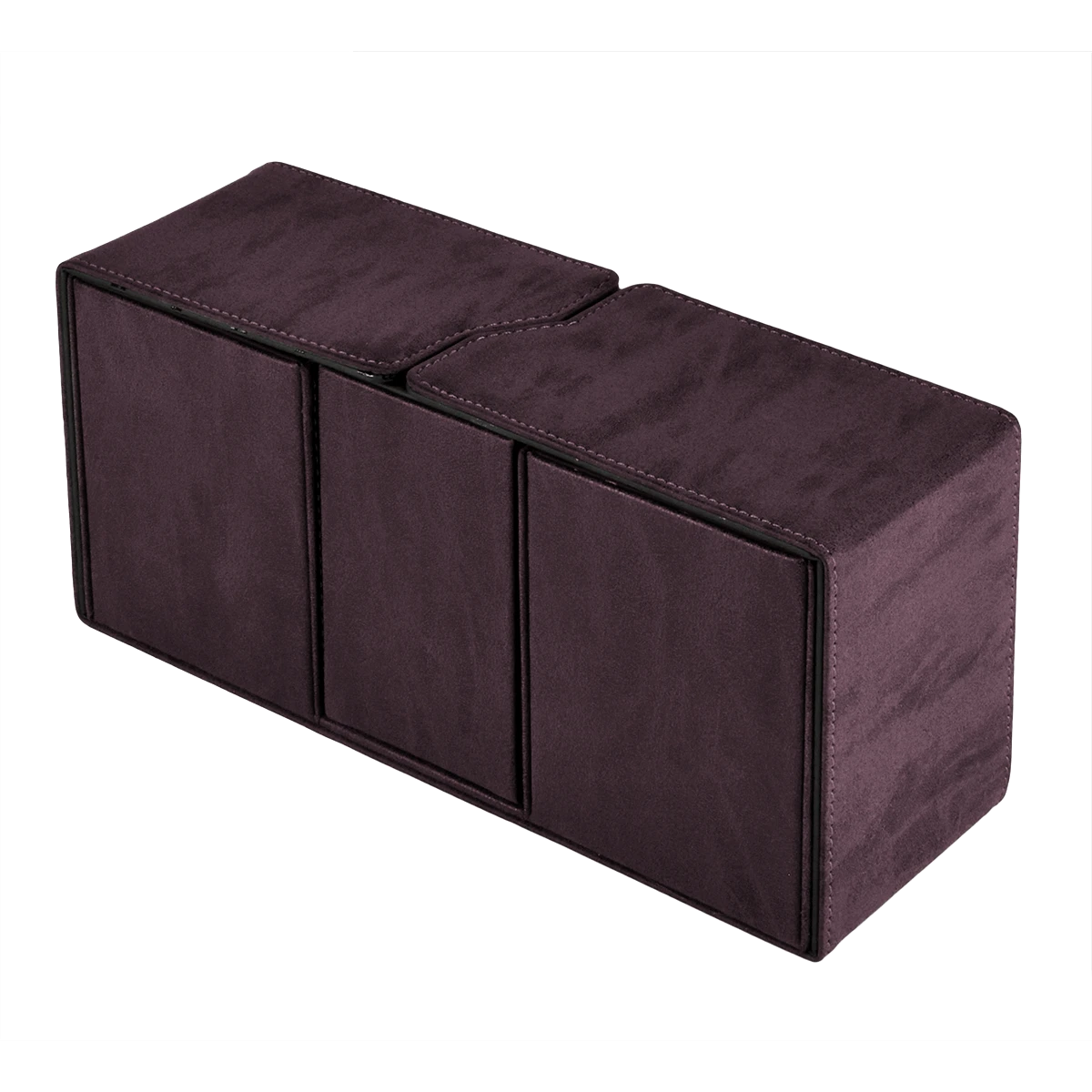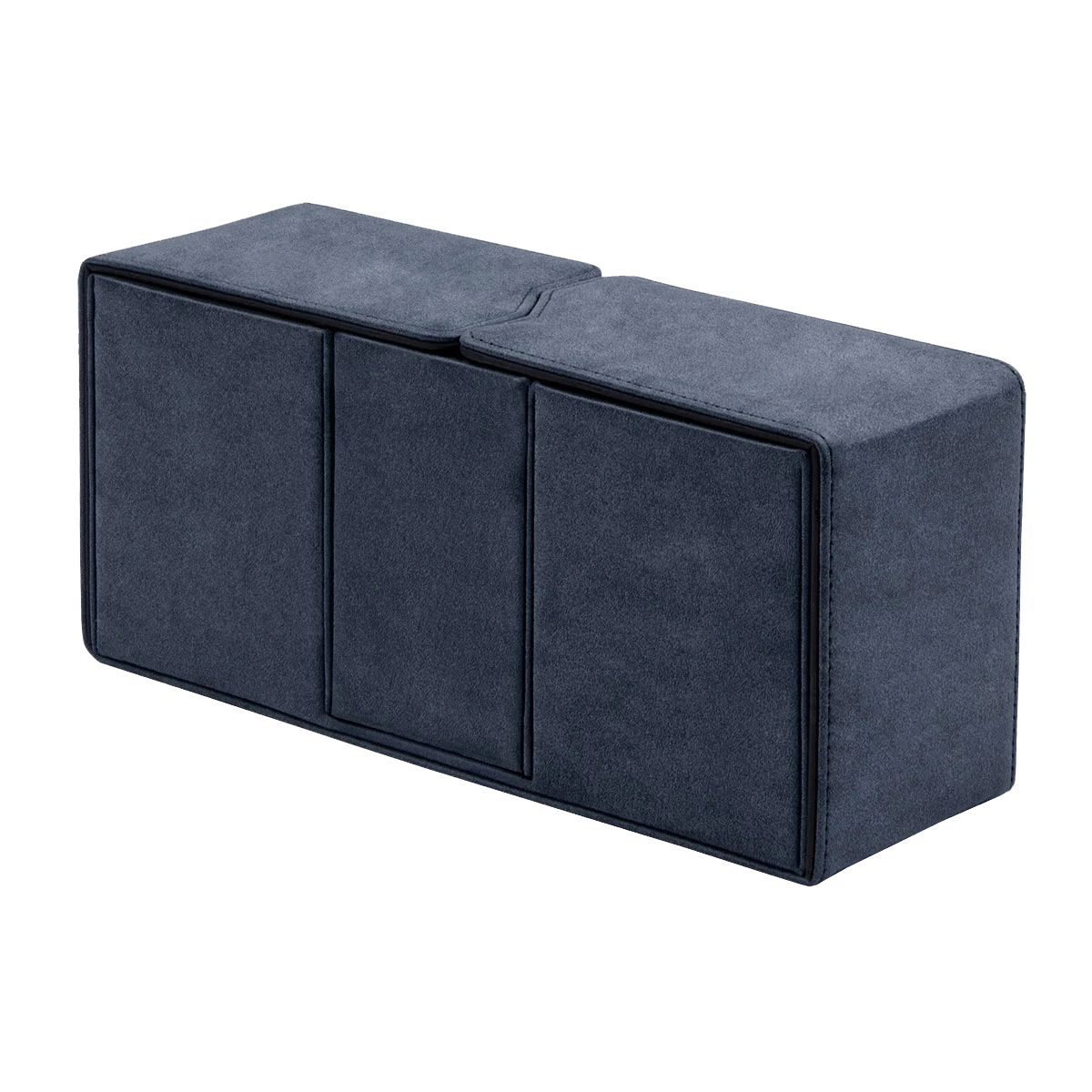 Bring your most powerful decks to the next game night with the Suede Collection Alcove Vault Deck Box! The Alcove Vault’s heavy-duty construction stores and protects up to three separate decks of cards in Deck Protector sleeves. Two compartments to the left and right of the Alcove Vault can each hold up to 100 sleeved standard sized (2.5″ x 3.5″) trading card game cards and feature easy-to-access finger notches to easily remove your decks. The center compartment can hold an additional deck or store dice, tokens, counters, and other small gaming accessories. The Alcove Vault’s lids are held secure by powerful magnets and the entire body is wrapped in premium leatherette material. The Suede line is available in Sapphire Blue, Emerald Green, Ruby Red, and Jet Black.